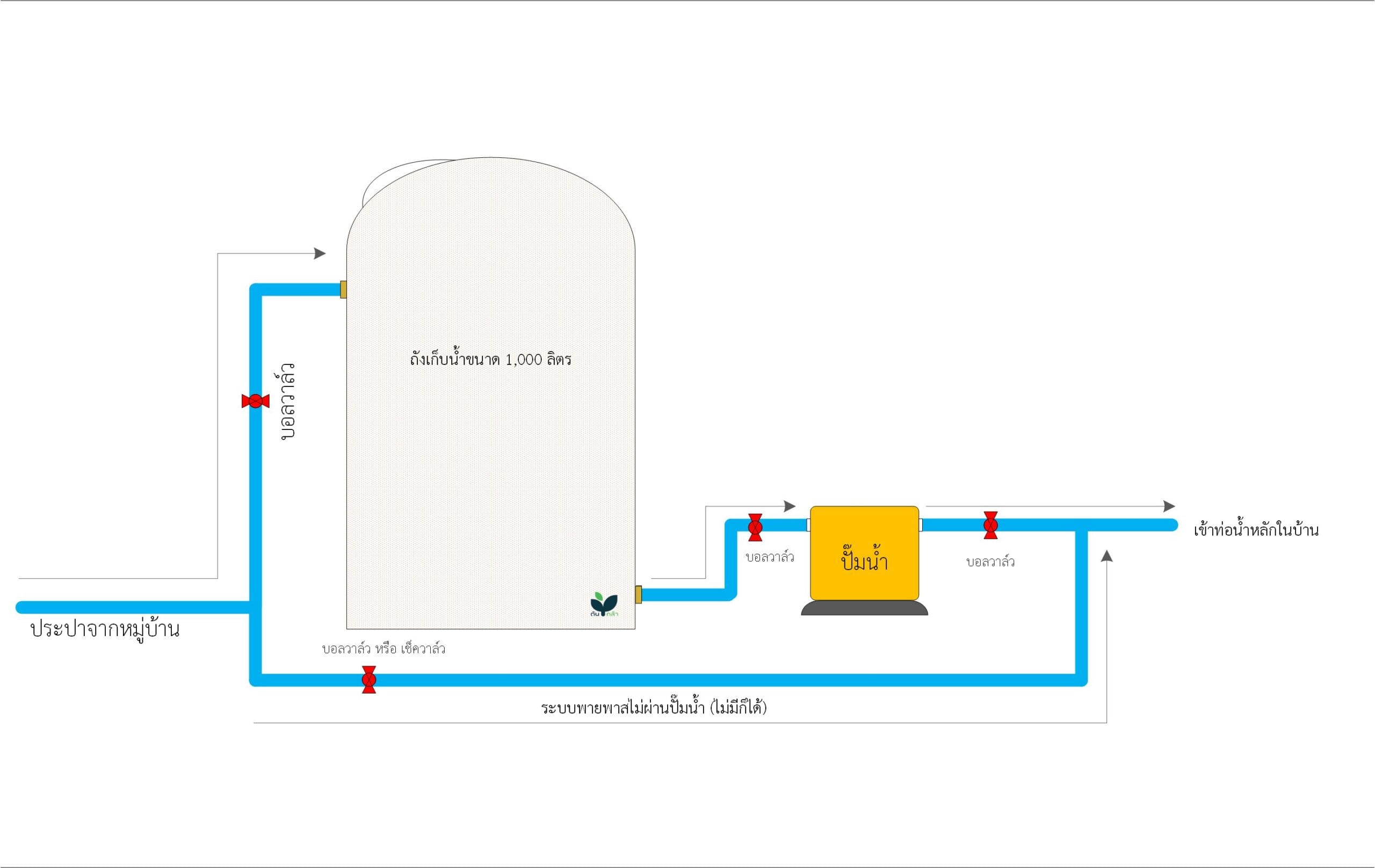 - แยกท่อจากท่อน้ำเข้าให้เป็นบายพาสออกไป ในกรณีที่ไฟดับ น้ำก็จะยังวิ่งผ่านท่อเข้าไปใช้งานในบ้านได้